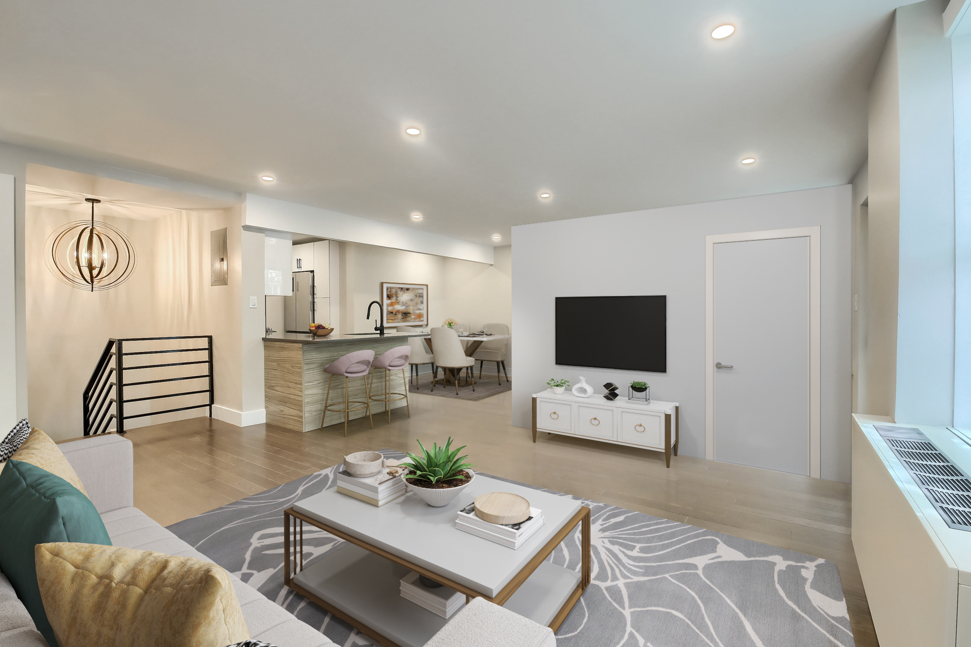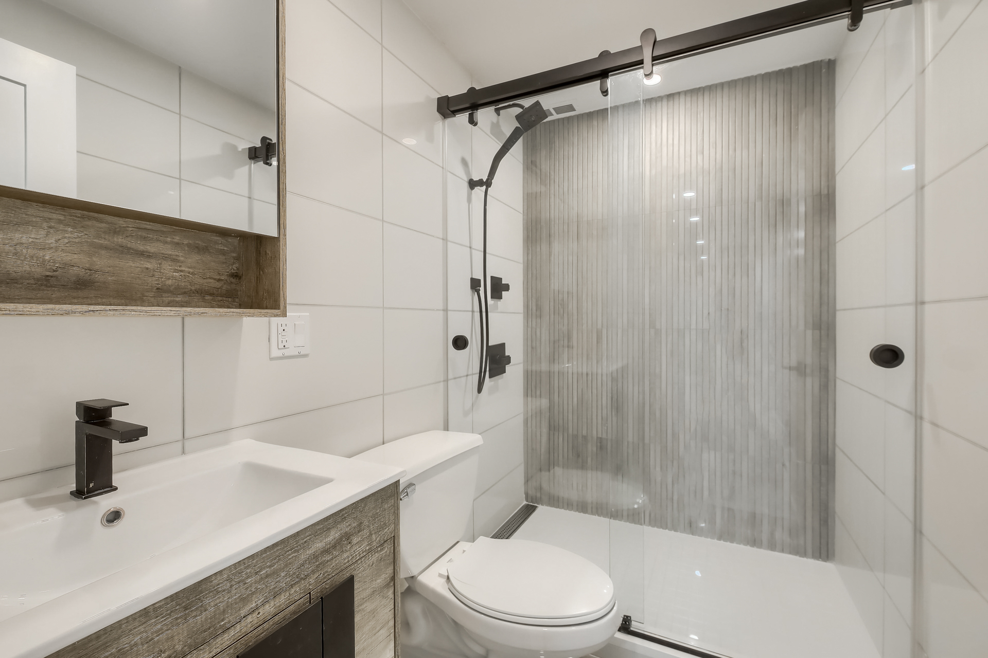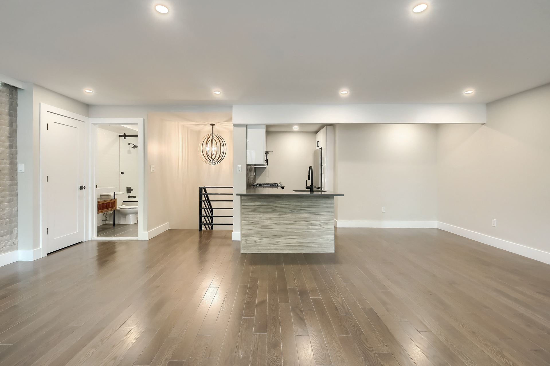 The main level offers a spacious living and dining area, perfect for entertaining, along with a sleek kitchen equipped with high-end stainless steel appliances, quartz countertops, ample storage, and a luxurious full bathroom. On the lower level, you will find spacious bedrooms with generous closet space, an alcove office, and a beautifully designed European bathroom, complete with a roomy stand-up shower.