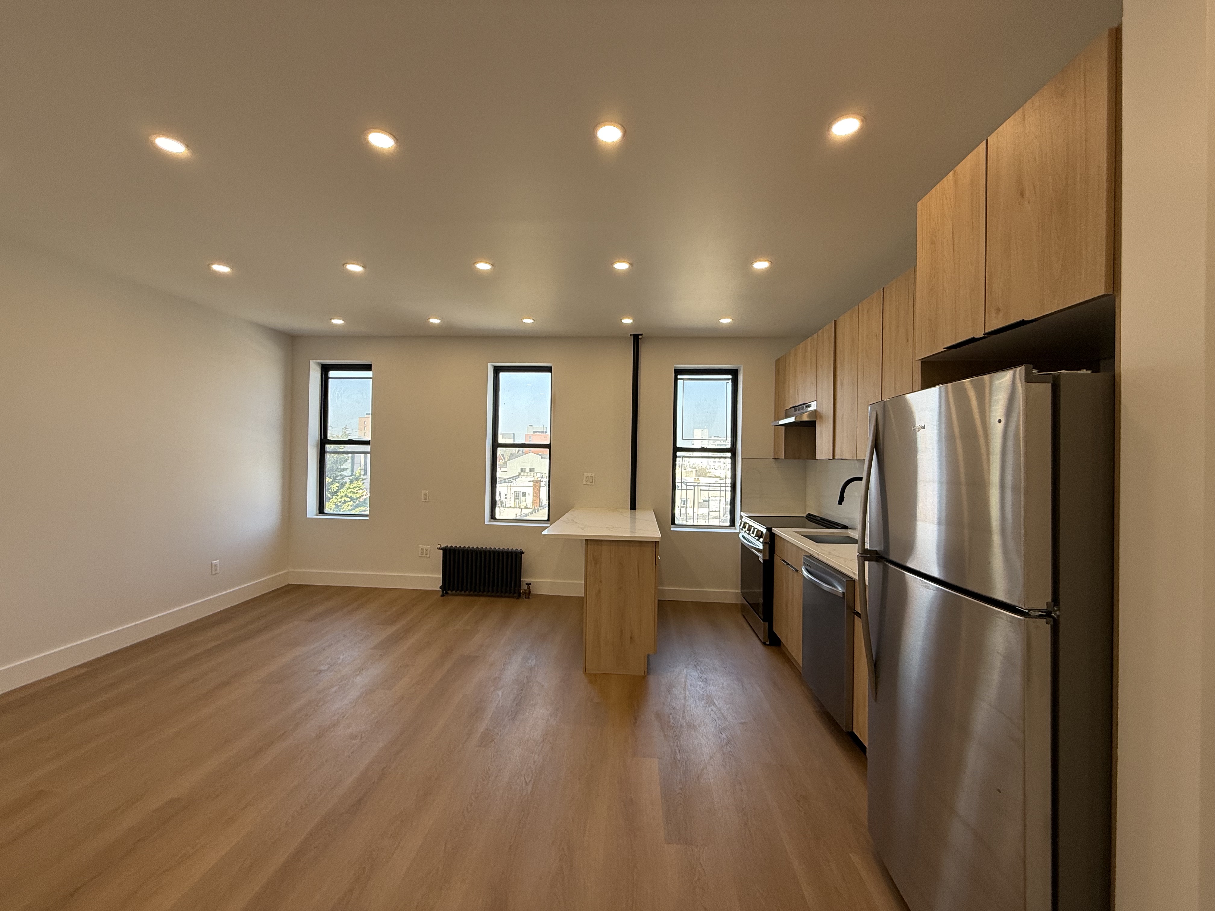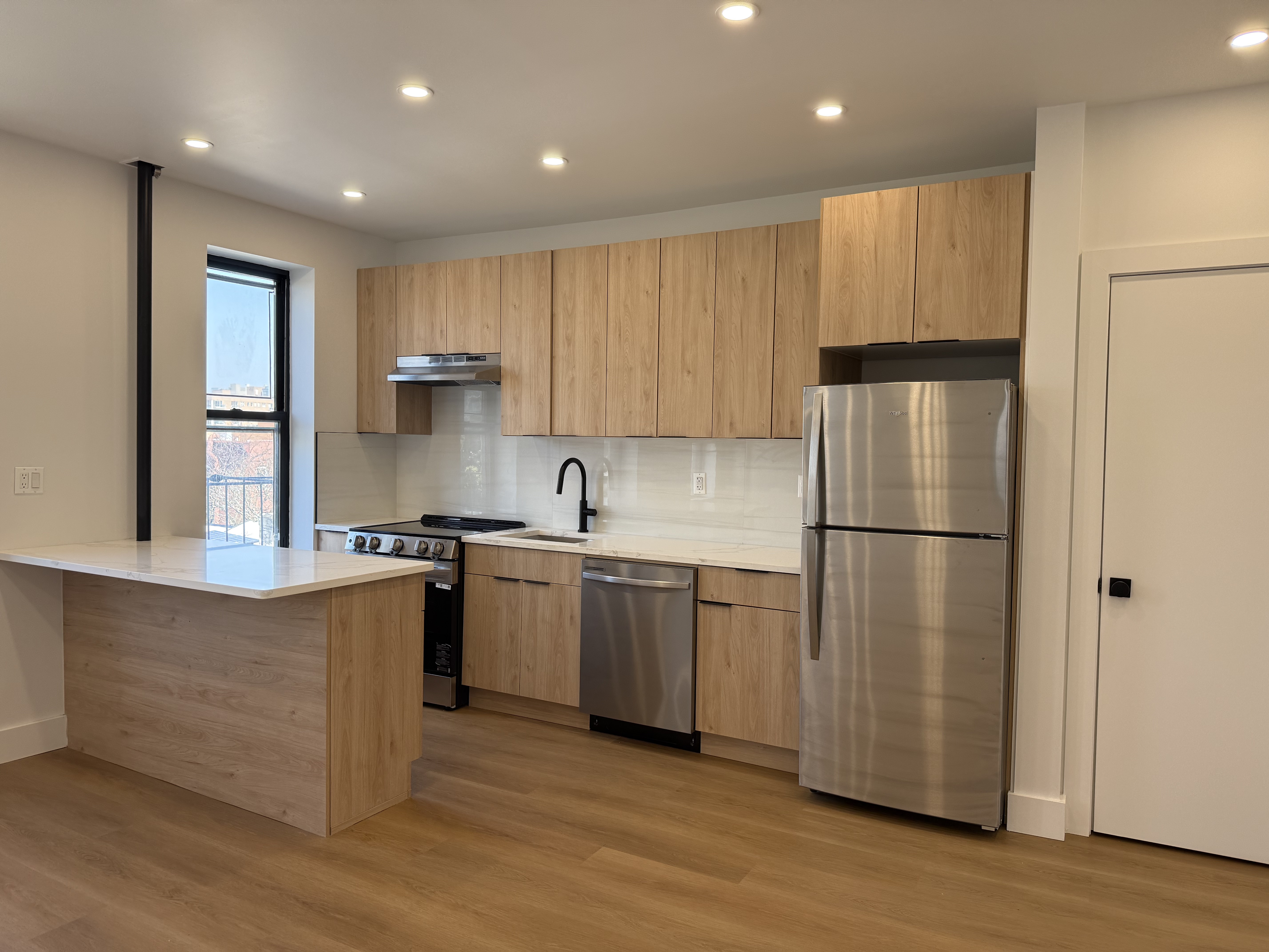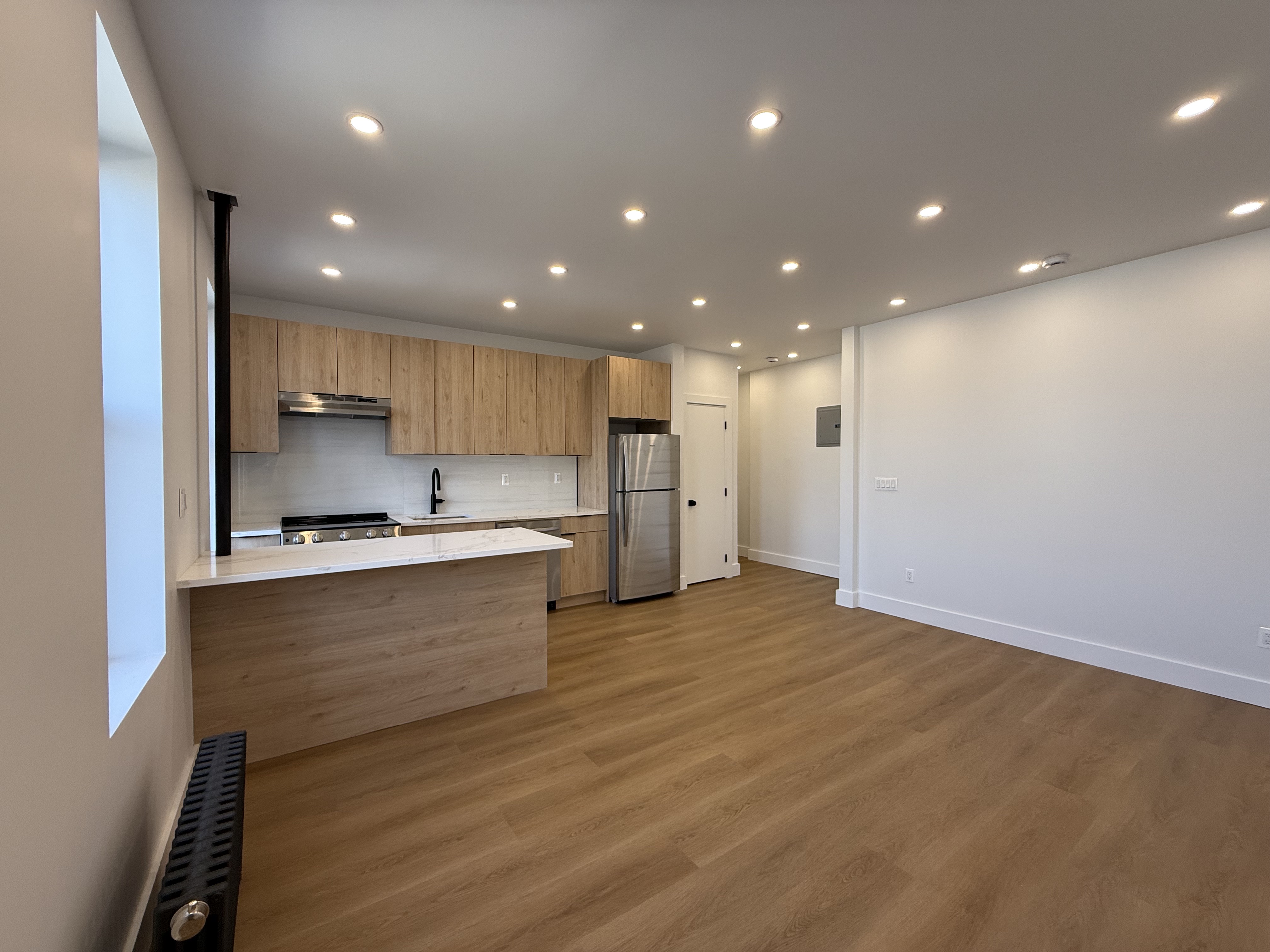 Completely renovated with recent upgrades. The building features a well-maintained pre-war lobby, recently redone. Everything is brand new. The apartment is sunny and spacious, with ample closet space, natural grain floors, and LED spotlights. The modern kitchen features a quartz countertop overlooking a sunlit living room and includes stainless steel appliances. Numerous windows provide abundant natural light. The large bedroom contains a wall-to-wall closet. The bathroom is finished with high-end tiles. This property is a must-see and is expected to lease quickly.